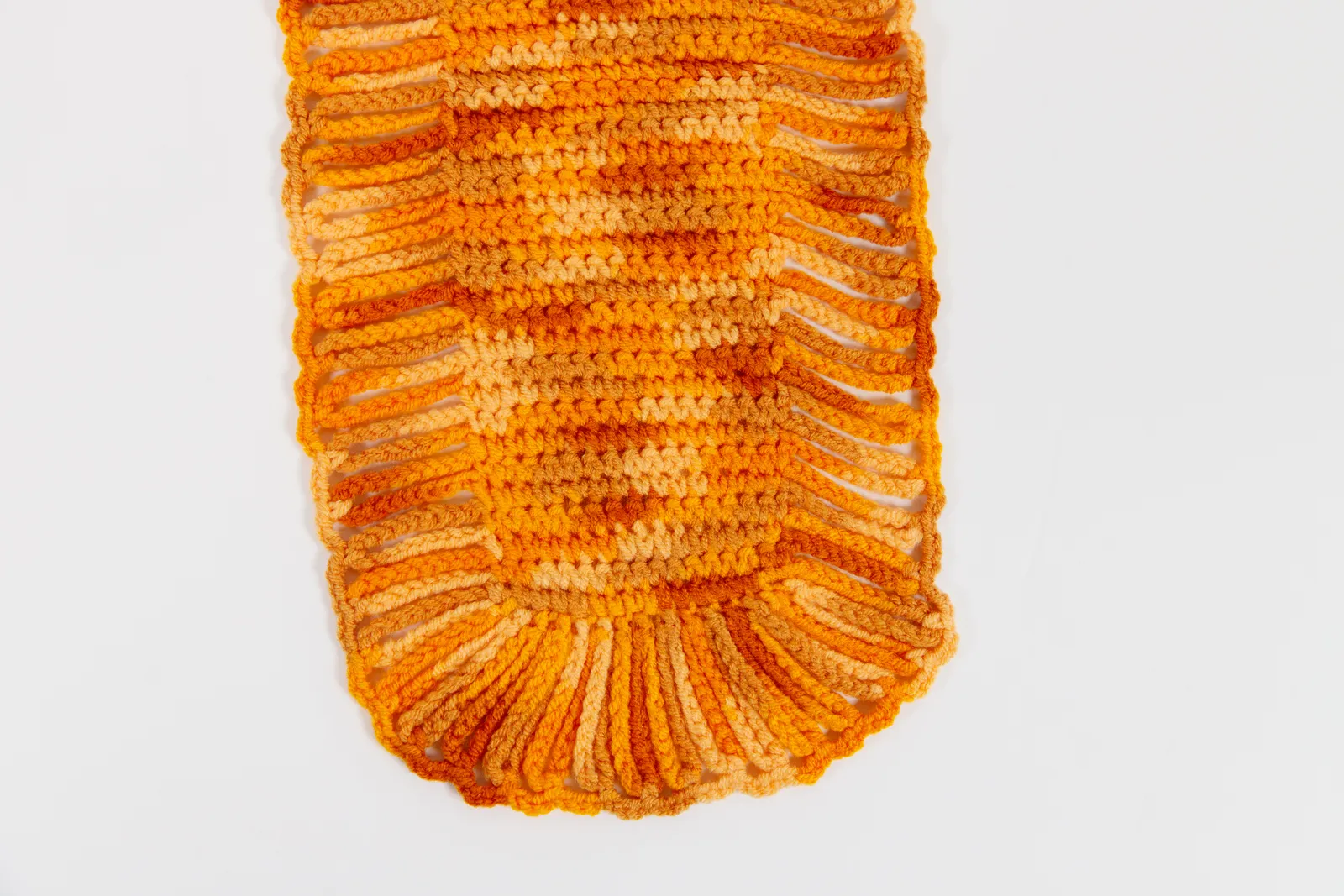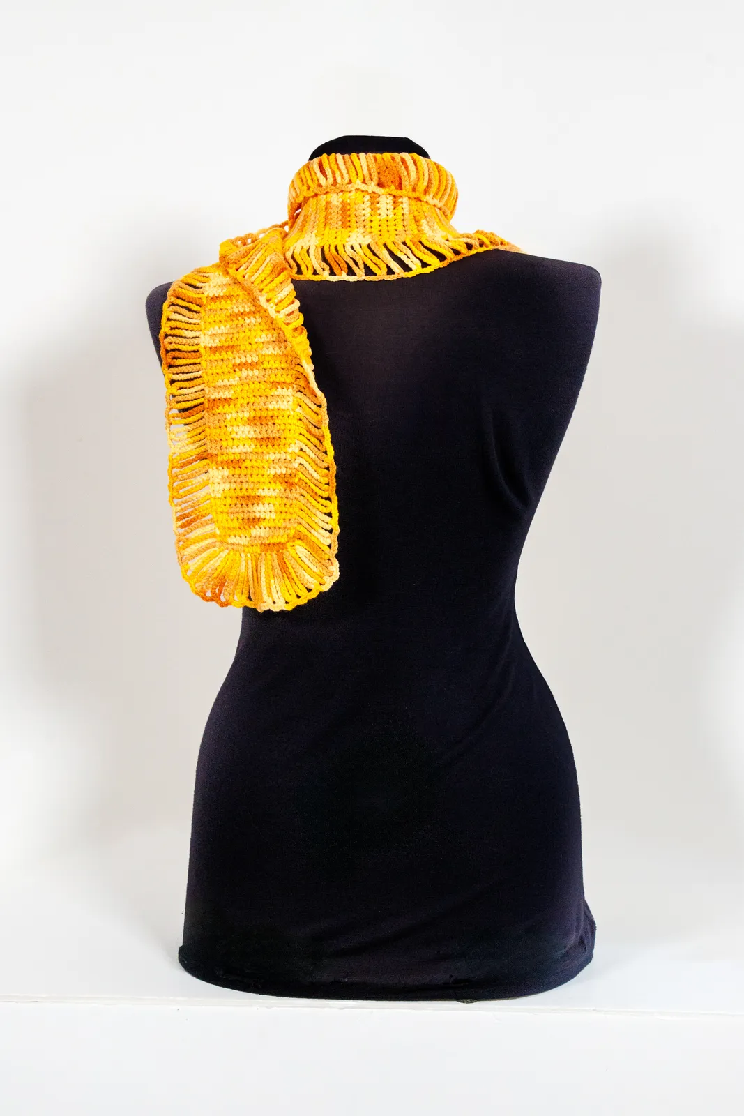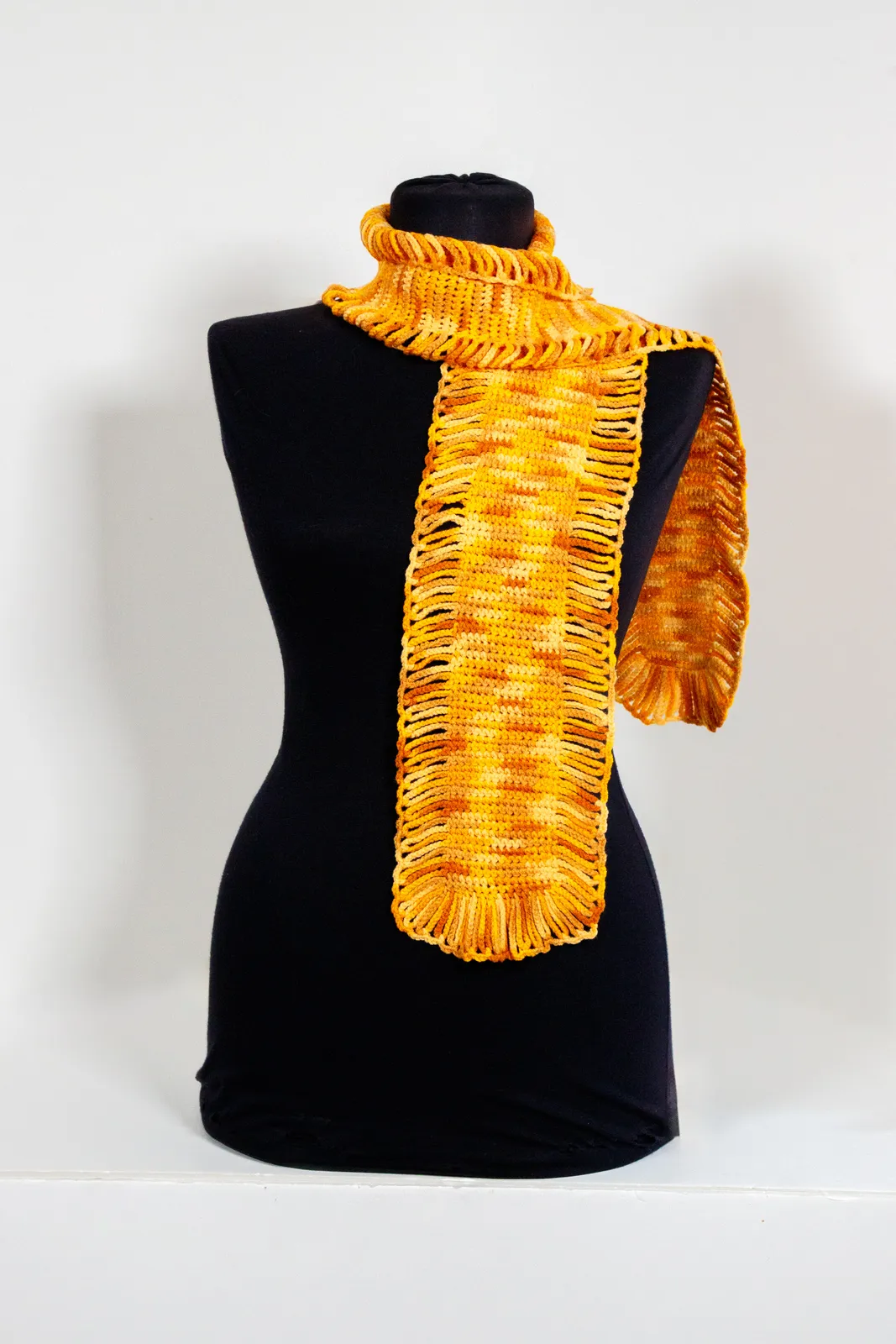 צעיף לערבים קרירים, עשוי בעבודת יד בטכניקת קרושה ייחודית. השילוב של צבעי הכתום, הצהוב מעניק לפריט מראה שמח וקליל, מושלם לשימוש יומיומי או כהשלמה אופנתית למראה חגיגי.