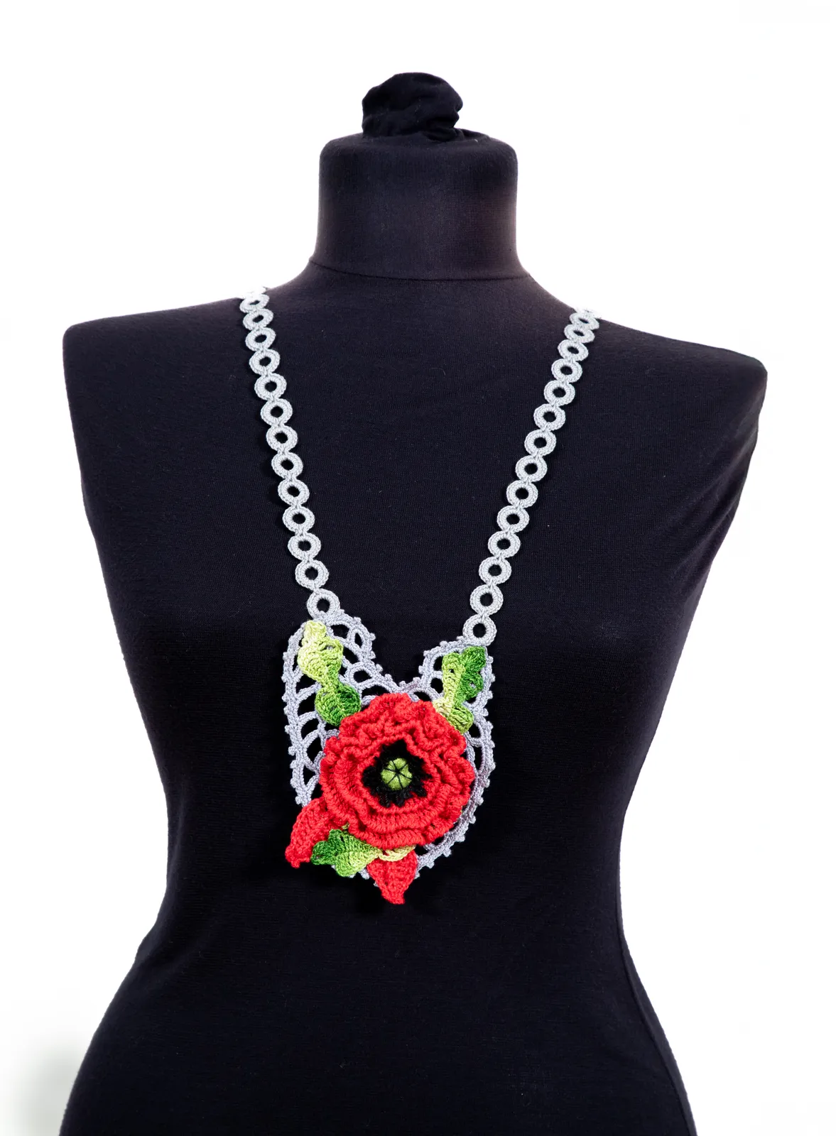 שרשרת מרהיבה וייחודית, עשויה בעבודת יד בטכניקת קרושה מוקפדת. השרשרת משלבת עיצוב עדין של לולאות אפורות עם פרח אדום עוצמתי המלווה בעלי ירק דקורטיביים, ליצירת מראה דרמטי ואופנתי.